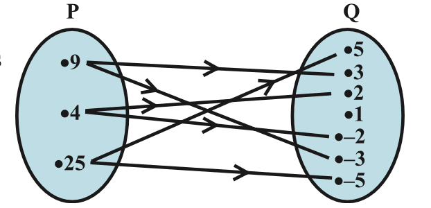 Example 8. The Fig 2.6 shows a relation between the sets P and Q. Write this relation (i) in set-builder form, (ii) in roster form. What is its domain and range?